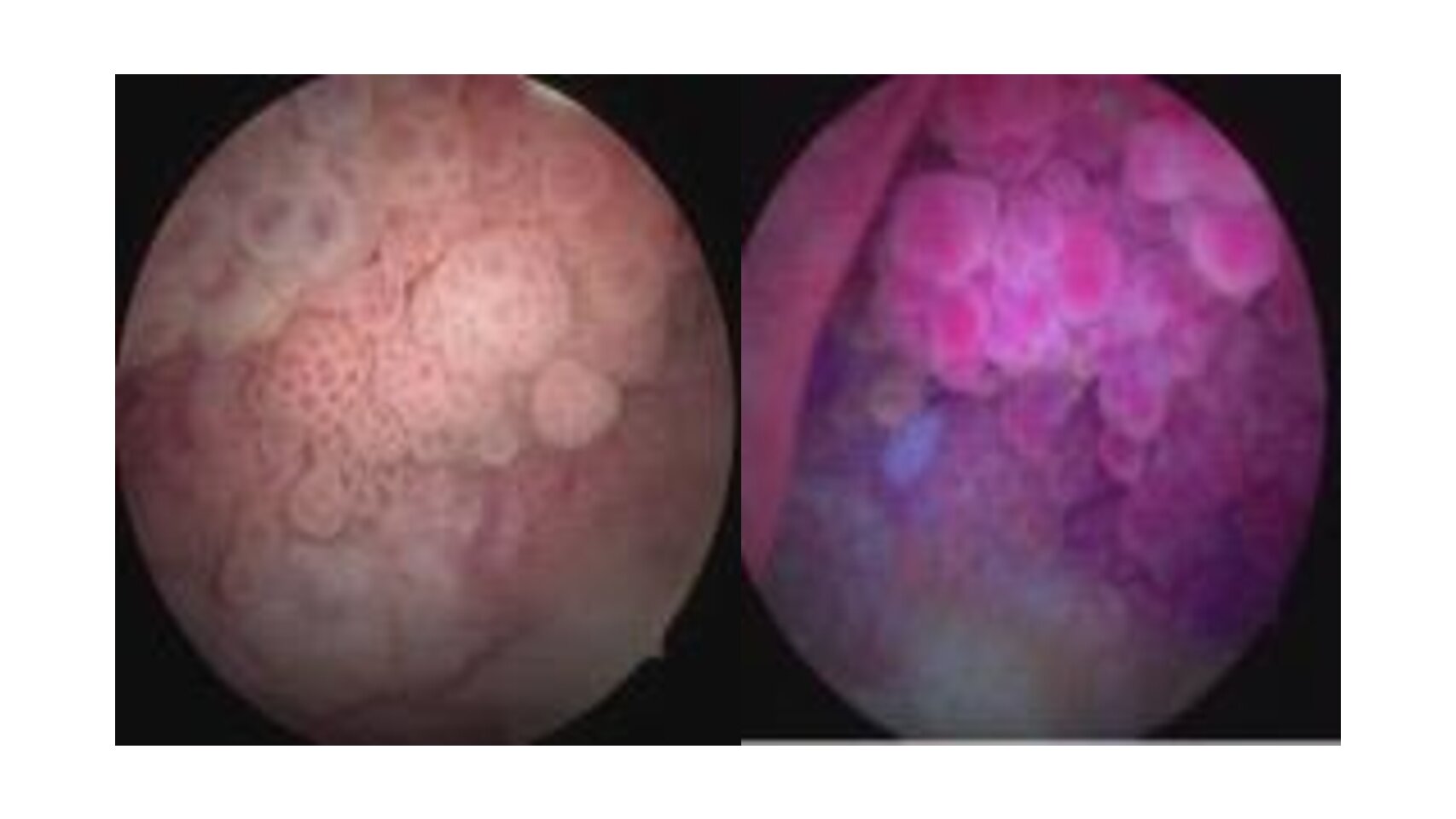 最近、これまでの内視鏡では確認することが難しかった小さながんや平坦な膀胱がんを、手術約2時間前に5-アミノレブリン酸という薬を服用していただき、特殊な光を発する膀胱鏡を用いることでがんを赤色に蛍光発光させて、より確実に…